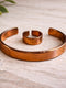 The bracelet features an open adjustable cuff design with discreet magnetic inserts placed inside the band. The matching plain copper band ring completes the coordinated look, creating a clean and sophisticated appearance.